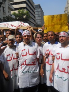 The old teaching union, dominated for years by leaders tied to the government, is “no good”, teachers on the protest insisted. “All the officials in the old union are appointed,” said one teacher. “We had Hosny Mubarak for 30 years, but the old union hasn’t had any change of leadership for 36 years”, added a colleague. Things are changing now that independent teachers’ unions are springing up all over the place. “Independent unions have been set up since the revolution, since we’ve been able to raise our voices and demand freedom”