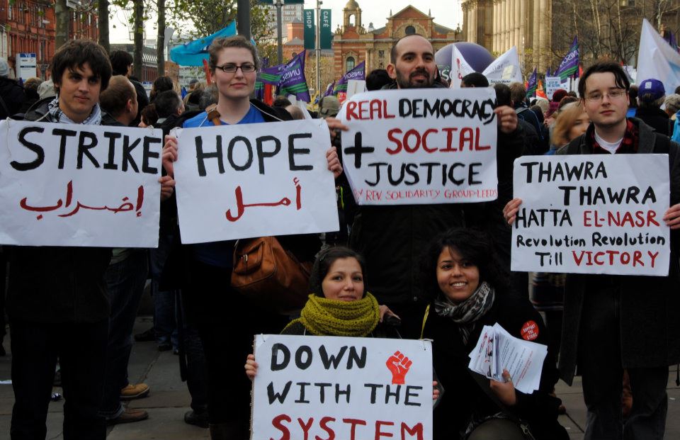 Students at Leeds University in the north of England held up placards in English and Arabic supporting the strike and calling for ‘real democracy’ and ‘social justice’