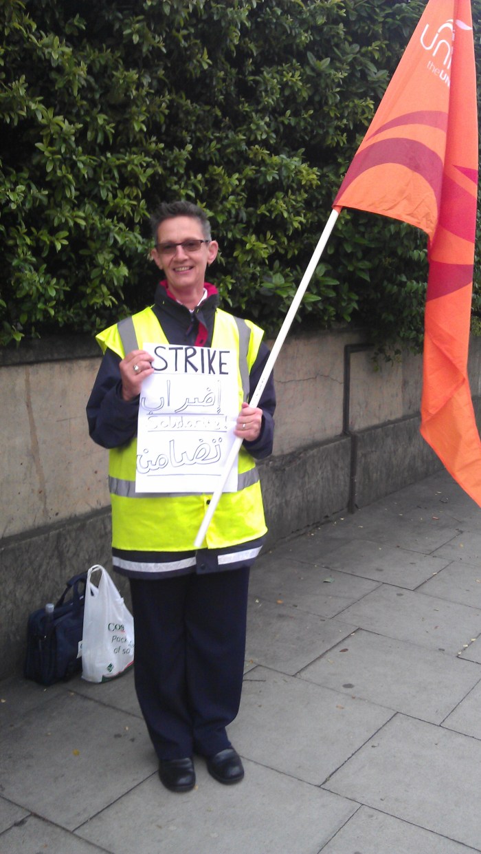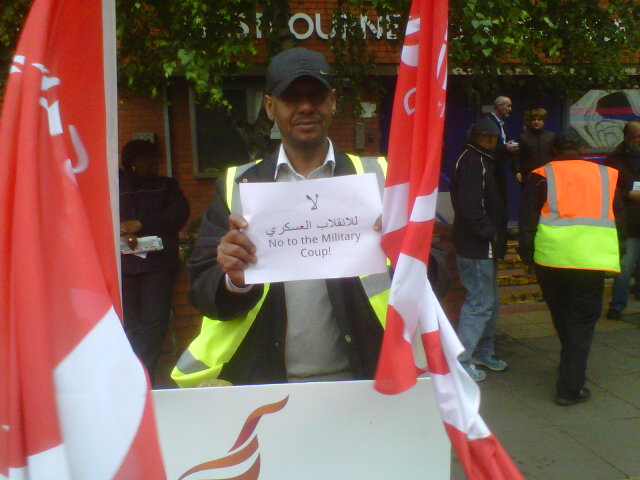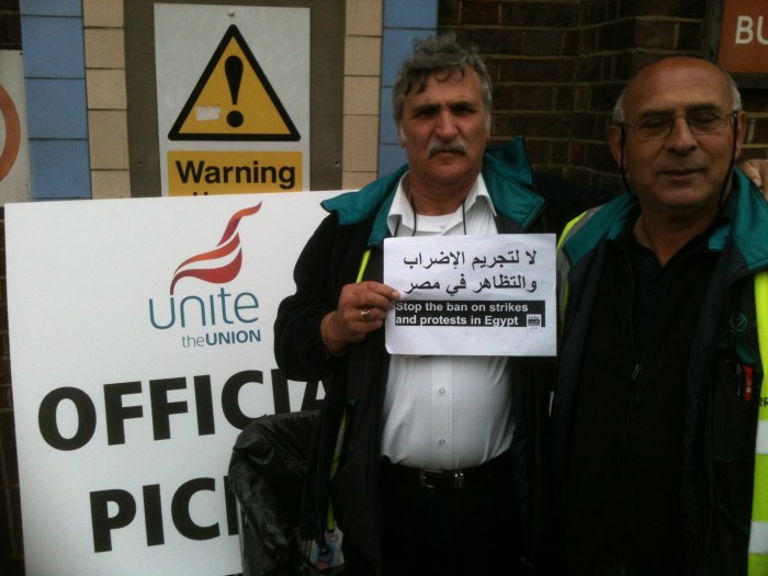Thousands of bus drivers across London took strike action on Friday 22 June to demand a bonus for the Olympics. MENA Solidarity activists visited the picket lines at four garages, bringing a message of support from bus workers in Cairo for the strike and asked the strikers to send back a message of solidarity to Egyptians in the face of attempts by the military council to undo the democratic gains of the past year.