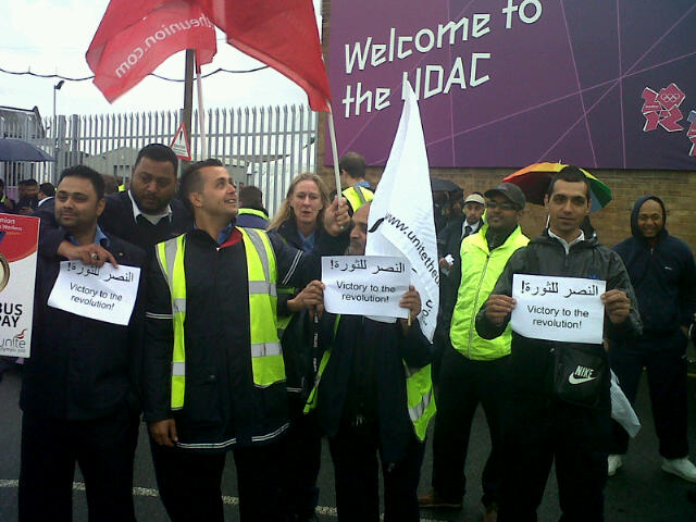 شارك الالاف من عمال النقل العام في لندن 22 يونيو من أجل مكفاحة الأولمبيات. وزار النشطاء من شبكة التضامن مع العمال بالشرق الأوسط وشمال إفريقيا اعتصامات العمال في 4 جراجات ووزعوا رسالة التضامن مع الإضراب من عمال النقل العام في القاهرة وطالبوا العمال المضربين أن يبعثوا رسالة التضامن إلى الثورة المصرية في مواجهة محاولات المجلس العسكري بإلغاء المكاسب الديموقراطية من السنة الماضية