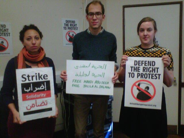 Nadine el-Enany (Defend the Right to Protest) Jeremie Bedard-Wien (from CLASSE student movement in Quebec) and Nina Power (Defend the Right to Protest) in solidarity with Mahdi Abu Deeb and Jalila al-Salman