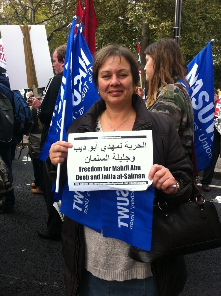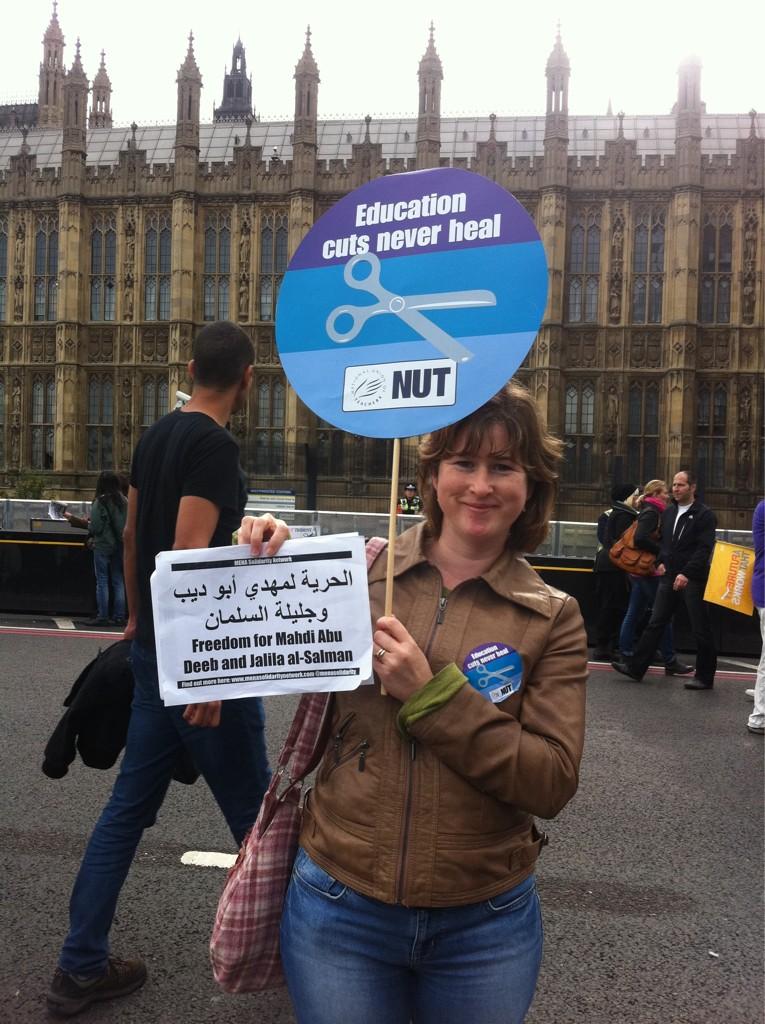 Teachers from around the UK sent solidarity messages to Bahraini Teachers’ Association leaders, Jalila al-Salman and Mahdi Abu-Deeb who are facing years in jail for peaceful protests. The verdict in their trial will be announced on 21 October. NUT and NASUWT members were among the hundreds of thousands marching on the TUC’s protest against cuts and austerity on 20 October.