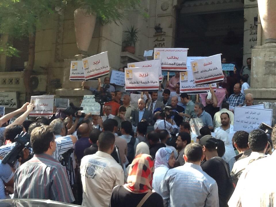 We joined hundreds of striking doctors and their supporters for a solidarity action which linked the Doctors’ Union headquarters on Qasr al-Aini Street with the Ministry of Health via a human chain a kilometre long.