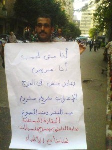 Nabil al-Sayyad, president of the Union of Car Maintenance Workers. The poster says “I am not a doctor. I am a patient and I demand my right to treatment. It’s right to strike against hunger and poverty. The Union of Car Maintenance Workers in solidarity with the doctors’ strike.”