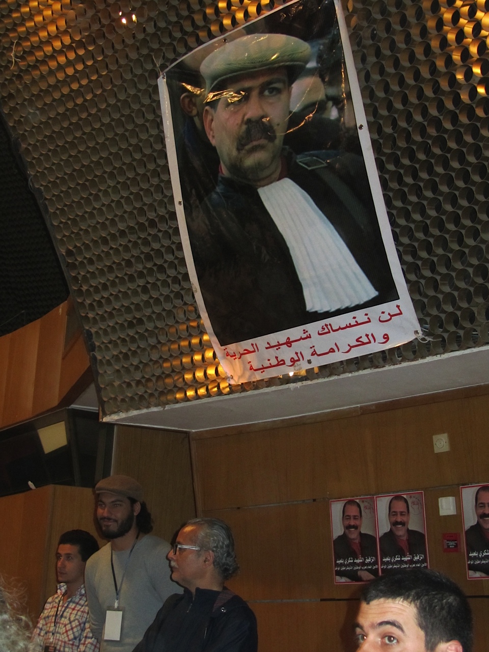 Around 1000 people filled the conference hall for a rally organised by the Tunisian Popular Front against the ‘Dictatorship of Debt’. Speakers from Arab countries joined representatives of left parties from Europe and Latin America. The meeting began with a video tribute to murdered leftist leader Chokri Beleid, who was shot dead a few weeks ago. Beleid was a key figure in the Popular Front. We heard the songs sung at his huge funeral demonstration, images of men and women waving Tunisian flags and chanting – lots of red scarves.
