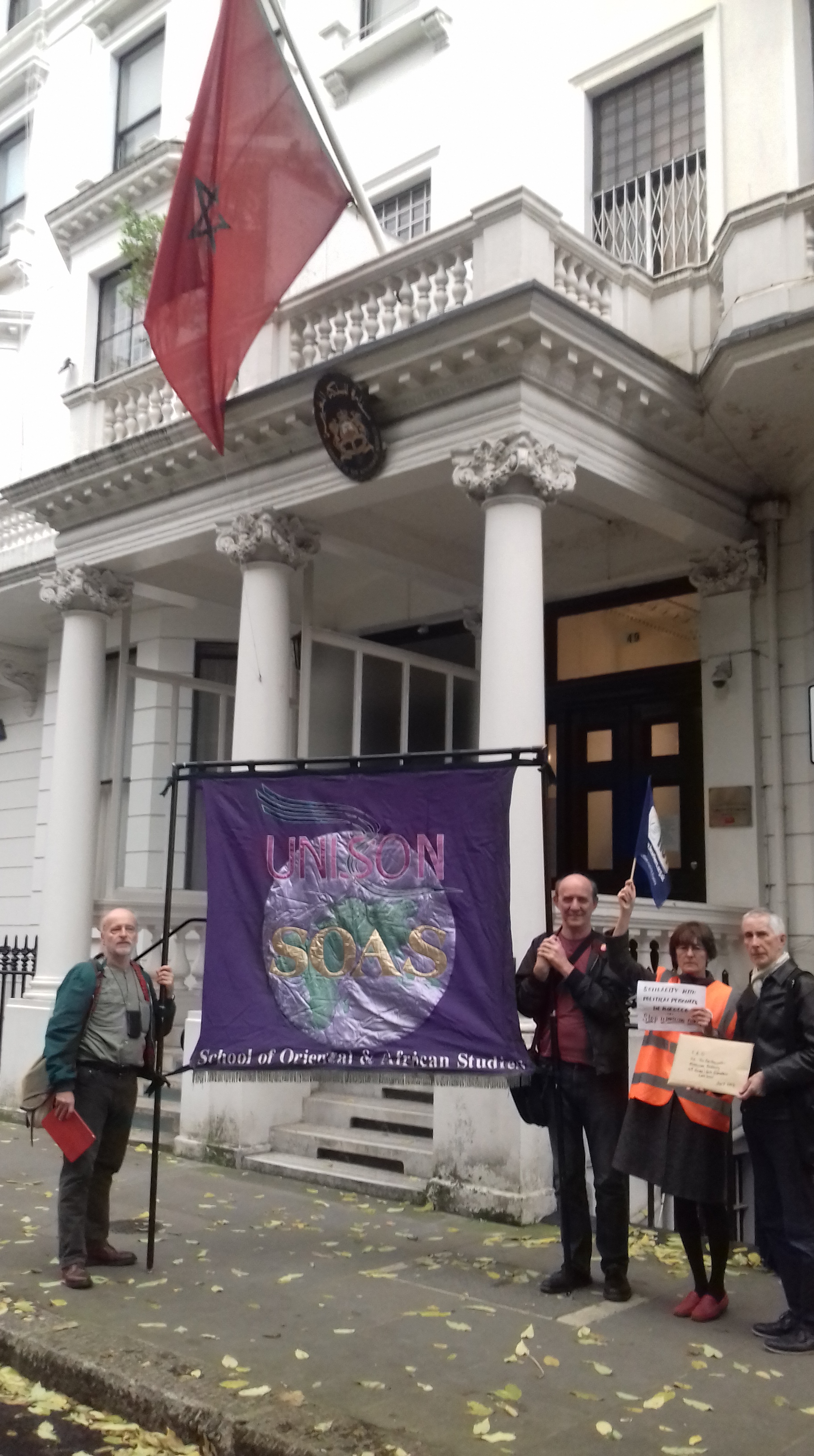 Representatives of four British trade unions visited the Moroccan embassy in London on 16 October to hand in a petition with over 500 signatures from trade unionists and activists calling for the release of political prisoners detained during the crackdown on the Hirak popular movement in the Rif region. The delegation was timed to highlight the upcoming trial of Hamid el Mahdaoui, editor of the news website http://www.badil.info which was set to begin on 17 October.