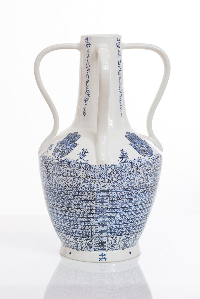 My title, ‘Tears that taste of the sea’ refers to the sea in which people drowned. I produced those large jars with their four handles – for which I got my inspiration from lachrymatories. Typically, lachrymatories are small jars made of glass (smaller than your little finger) that women would put by the corner of their eyes to collect the tears from the loss of a child, husband, father, mother, as well as to collect tears of joy.