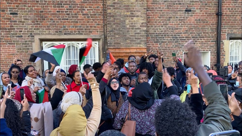 Sudanese activists in Britain are mobilising in solidarity with the protests. At a few hours notice around 200 gathered outside the Sudanese embassy in London. Many were holding signs opposing the military coup and waving Sudanese flag. Protesters chanted for civilian rule and denounced the military coup. “We want democracy and peace”, the crowd chanted. They warned the military regime that the “Nubian queens and revolutionary boys are in the square” while a Nubian flag was seen being waved within the protest. Defiance and anger could be felt among the protesters as a speaker informed the gathering of the casualties in the streets of Sudan.