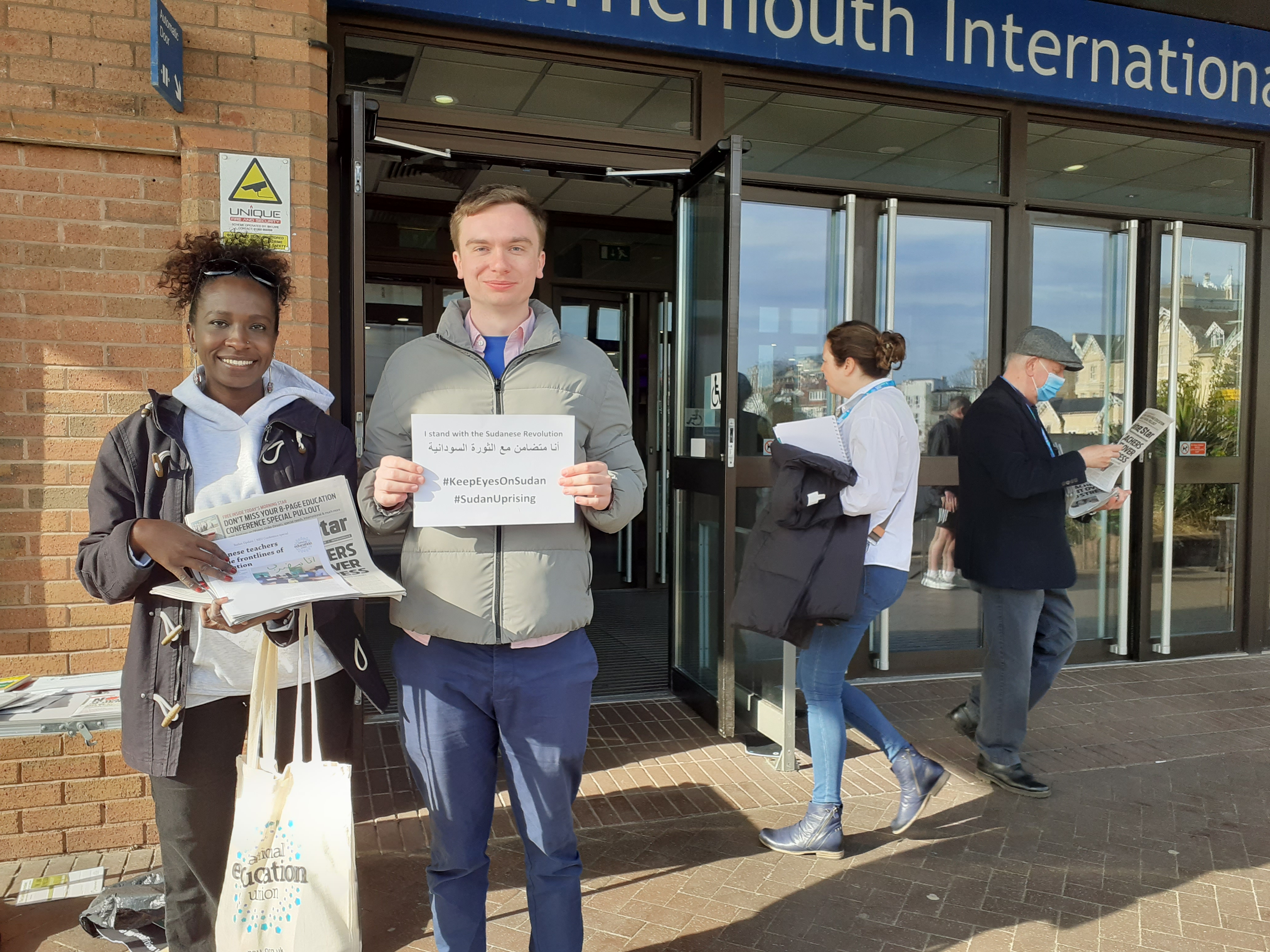 The NEU invited two Sudanese teachers to the National Education Union Conference 2022 in Bournemouth. Due to the current unrest in Sudan and the challenges facing Sudanese teachers it was impossible to arrange for them to attend from Sudan. So, it was agreed that two representatives from the Sudan Uprising Group would attend to advocate for the STC. The NEU kindly hosted the representatives, and a stall was booked for the event. The NEU prepared the stall and printed including a newsletter detailing the current STC struggles and their strike since 10 March 2022. The stall was well attended and many selfies were taken by Educators and other conference delegates in solidarity with the teachers in Sudan.
