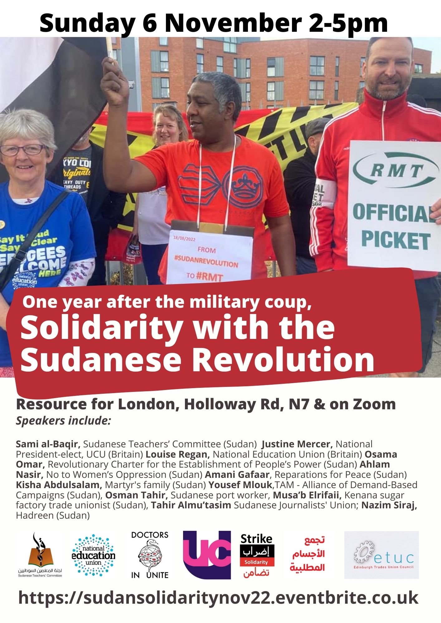 Sponsoring organisations include: MENA Solidarity, National Education Union (Britain), University and College Union (Britain) Sudanese Teachers’ Committee (Sudan), Edinburgh TUC (Scotland), TAM – The Alliance of Demand-based Campaigns (Sudan), Doctors in Unite (Britain), Portsmouth Unison (Britain), Portsmouth TUC (Britain), Unite the Union, Barts Health Branch LE384L (Britain)