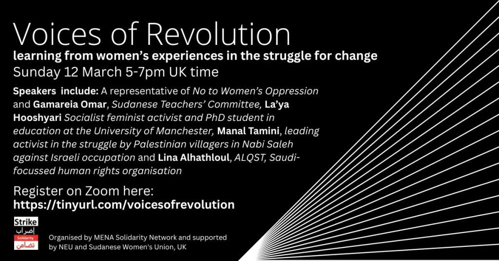This online event is hosted by Middle East North Africa Solidarity Network in collaboration with activists from Sudan, Iran, Palestine and elsewhere in the Middle East with the support of the National Education Union (NEU) and the Sudanese Women’s Union, UK. It will create a space for trade unionists and activists around the world to hear the voices of women who have been involved in leading and organising strikes, protests and campaigns fighting for liberation from oppression, democracy and social justice. Through discussion and debate we will address the following questions: