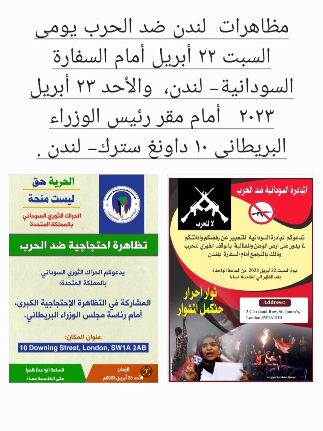 - 23 April outside 10 Downing Street, 1.30pm – 5pm (Called by the Sudanese Revolutionary Movement – UK)