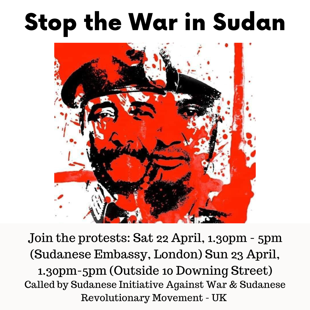 - 22 April outside the Sudanese Embassy, 3 Cleveland Row, St James, SW1AA 1DD 1.30pm – 5pm (Called by the Sudanese Initiative Against War)