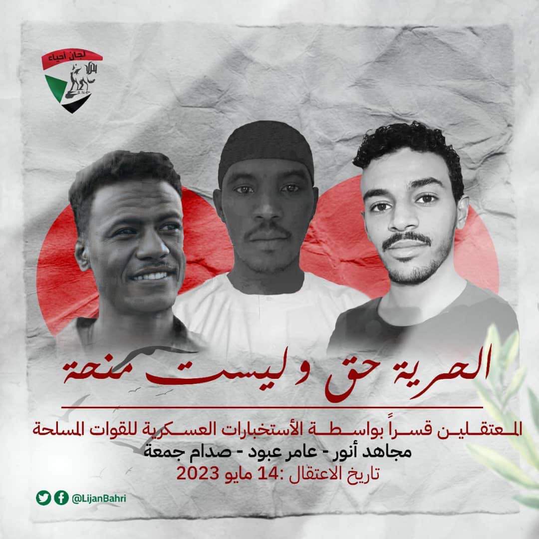 Three activists arrested by the Sudanese Armed Forces are being “tortured daily”, according to Bahri Resistance Committees. Saddam Juma’a, Amer Abboud and Mujahid Anwar were arrested by Military Intelligence on 14 May and detained in ِAl-Dhakira military base in Al Kadaro, which is a building to store ammunition and weapons, and have been held without charge or trial.