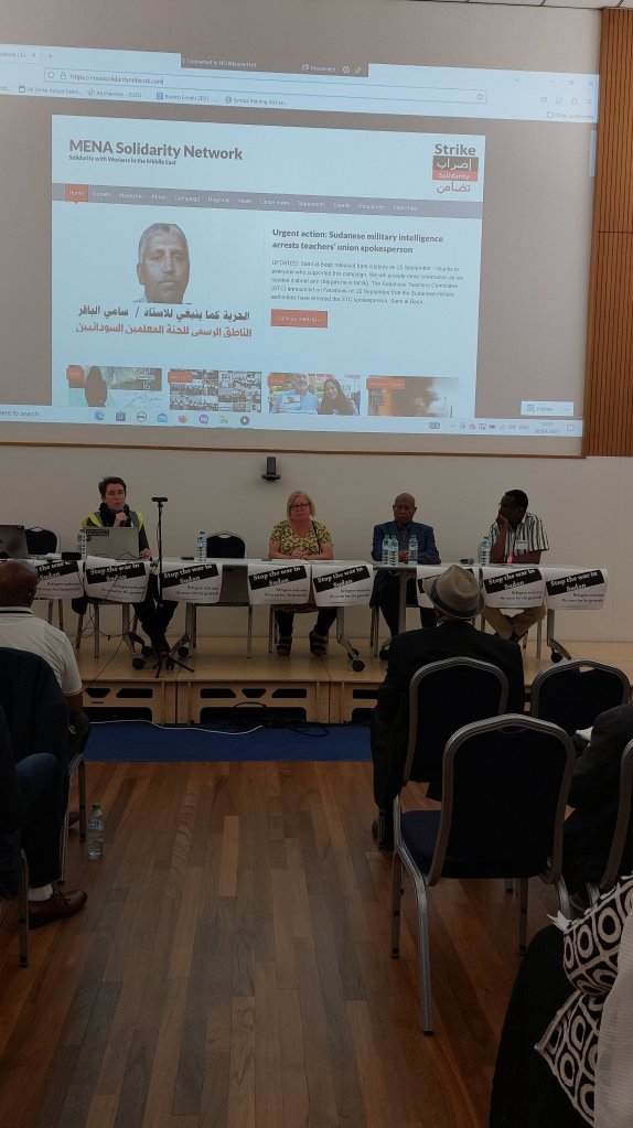 قدم سامي الباقر، المتحدث باسم لجنة المعلمين السودانيين، نظرة عامة و شاملة على التحديات العديدة التي تواجه المدارس والمعلمين في المشهد الحالي. قدم السيد الباقر رؤيته من خلال رسالة مسجلة ( تضرر المعلمون و الطلاب بصورة كبيرة جدا من هذا النزاع و وصل هذا الضرر الى مرحلة القتل، حيث حصرنا في مدينة نيالا فقط مقتل اكثر من عشرين معلما بسبب القصف من الطرفين. كذلك في الولايات الاخرى عدد من القتلى من الطلاب و المعلمين. كذلك قطاع التعليم الذي لحق به ضرر كبير جدا و الذي يعمل به أكثر من ٣٠٠,٠٠٠ موظف حيث حُجِبت عنهم المرتبات منذ بداية الحرب في ١٥ ابريل لمدة لا تقل عن ٥ اشهر و نحن الآن ندخل في الشهر السادس. هذا الأمر جعل لجنة المعلمين تتحرك في المطالبة بهذه الحقوق و تم رفع مذكرات لولاة الولايات و للحكومة الاتحادية و لمنظمات العمل الدولية. هذه المناهضة كان عندها اثر كبير جدا على القرار الذي قضي بحجب المرتبات حيث بدأ استئناف المرتبات بصورة خجولة في بعض الولايات و نتمنى ان تسفر هذه المسائل لإستعادة مرتبات العاملين بالتعليم. كذلك تم استهداف المعلمين الناشطين و المطالبين بحقوقهم و المنادين بإيقاف الحرب في كثير من الولايات بالاعتقال التعسفي من كلا الطرفين، سواء كان الجيش السوداني او الدعم السريع. هذا الواقع جعل المعلمين الناشطين عرضة لإنتهاكات حقوقهم الانسانية. نتمنى من النقابات في العالم و النقابات في بريطانيا التضامن في هذه القضية العاجلة و رفع الصوت عاليا بضرورة إيقاف هذه الحرب التي تنتهك حقوق الانسان و من بينهم المعلمين و العاملين بالتعليم)