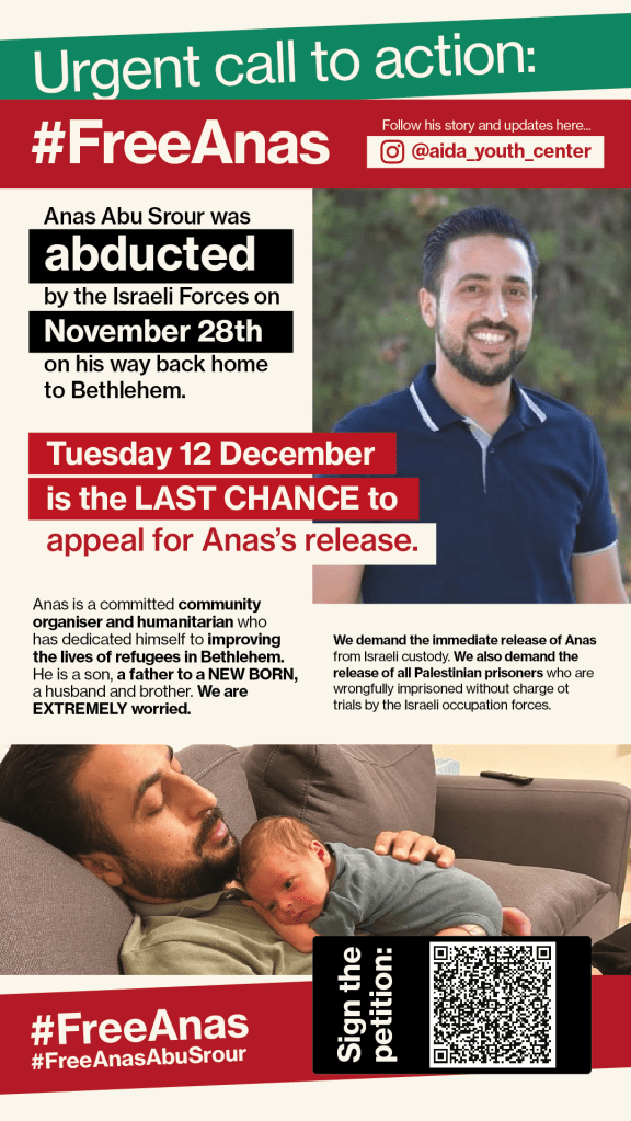 A petition calling for the release of Palestinian community organiser Anas Abu Srour has already gathered thousands of signatures after his abduction by Israeli Occupation Forces on 28th November. Anas is the executive director of the Aida Youth Centre, which provides services for around 300 children in one of the largest refugee camps in Bethlehem. Children in Aida camp play in the shadow of an 8-metre concrete separation wall complete with Israeli military watchtowers. A plaque at the camp’s entrance welcomes visitors to “the most teargassed place in the world”.