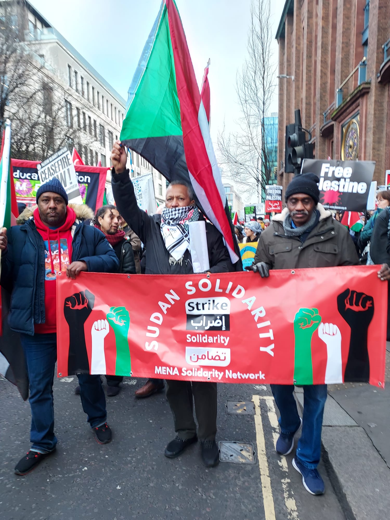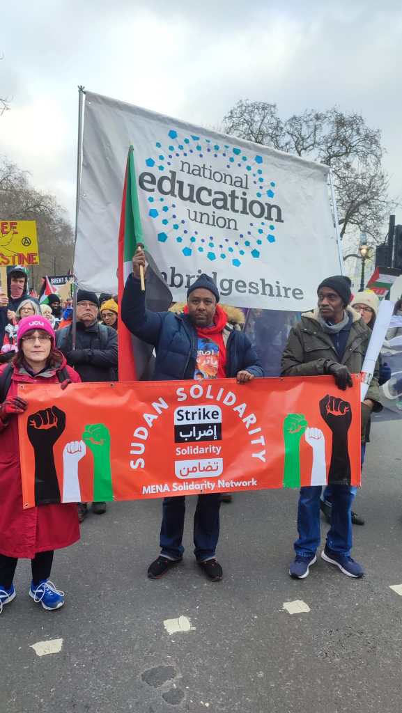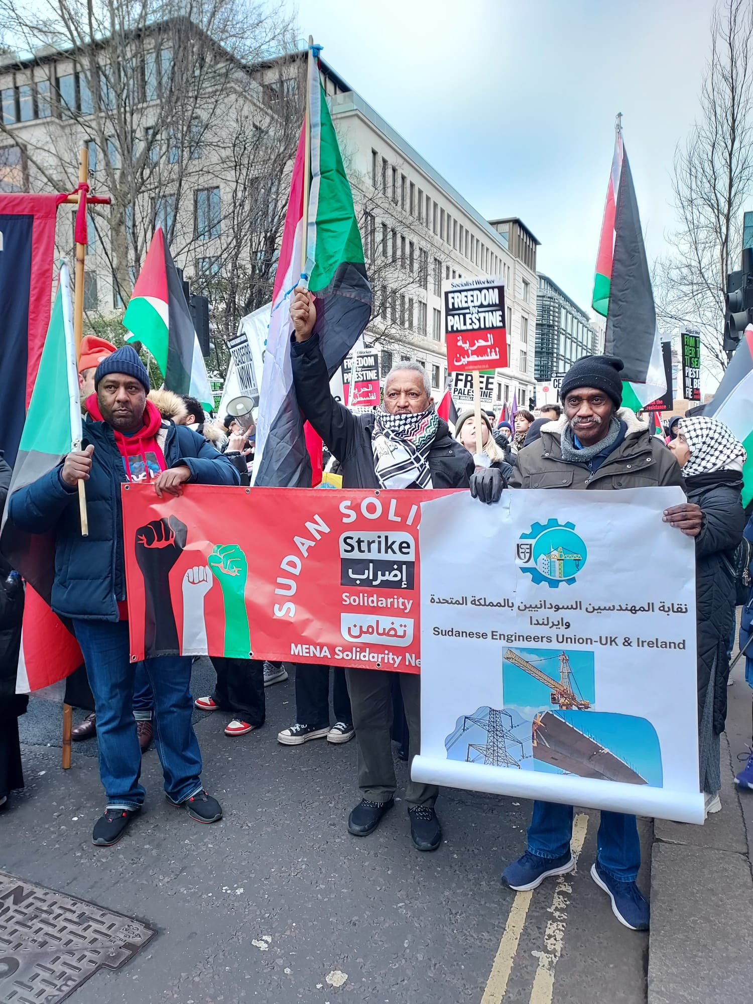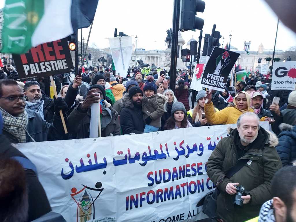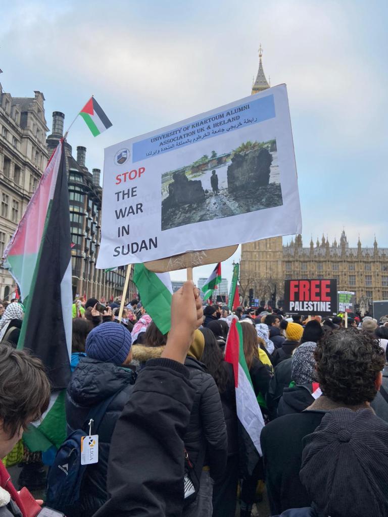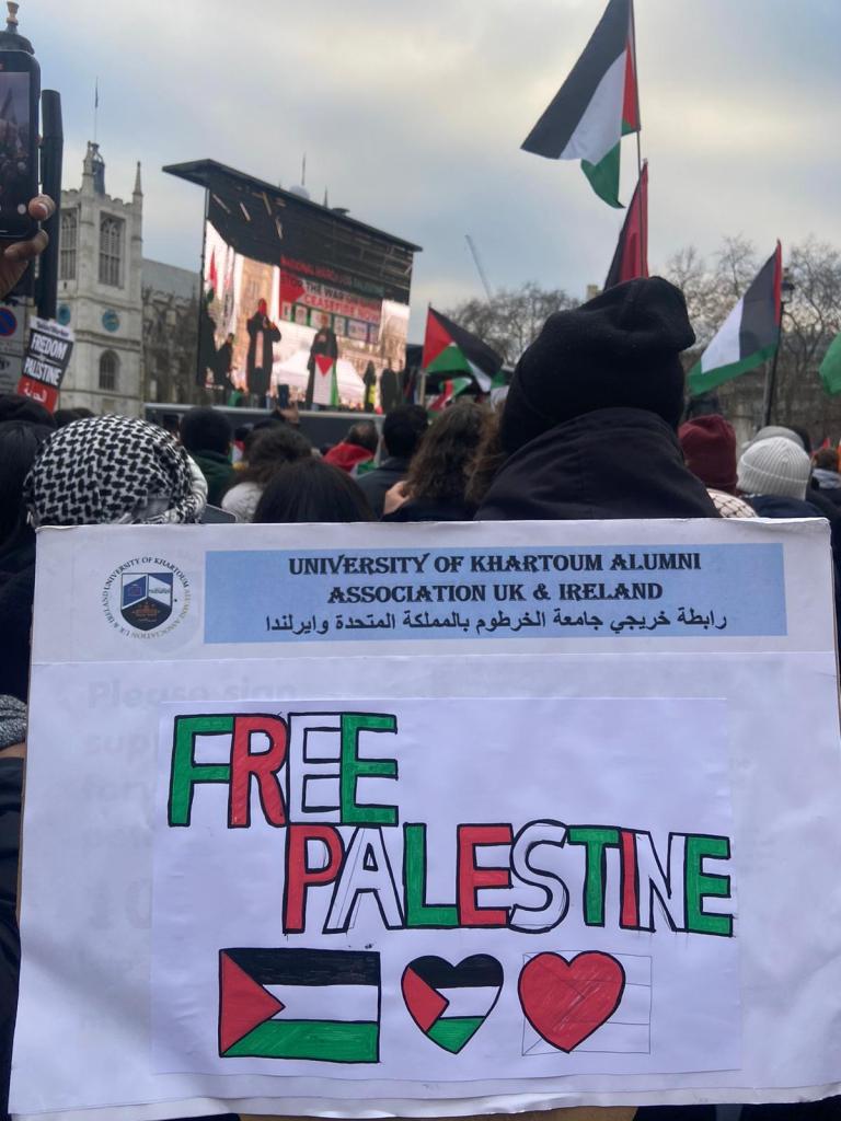 Leaders from the Sudanese Engineers Union in the UK joined the march, alongside Vice President Salah Hasan and General Secretary Alaa Galgal. Leaders from the Sudanese Community & Information Centre – London, including President Nadir Banda, Vice President Mohamed Elfatih, and General Secretary Omima Eltayb, as well as representatives from the University of Khartoum Alumni Association UK & Ireland, joined forces in a powerful display of solidarity with the Palestinian cause.