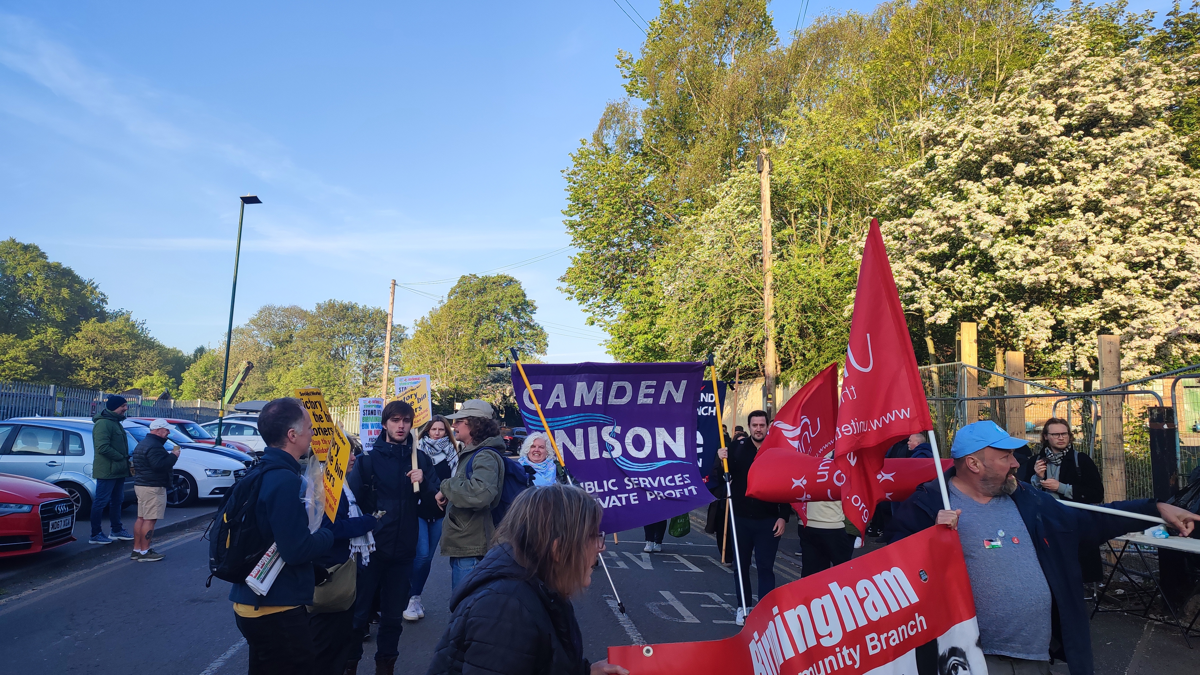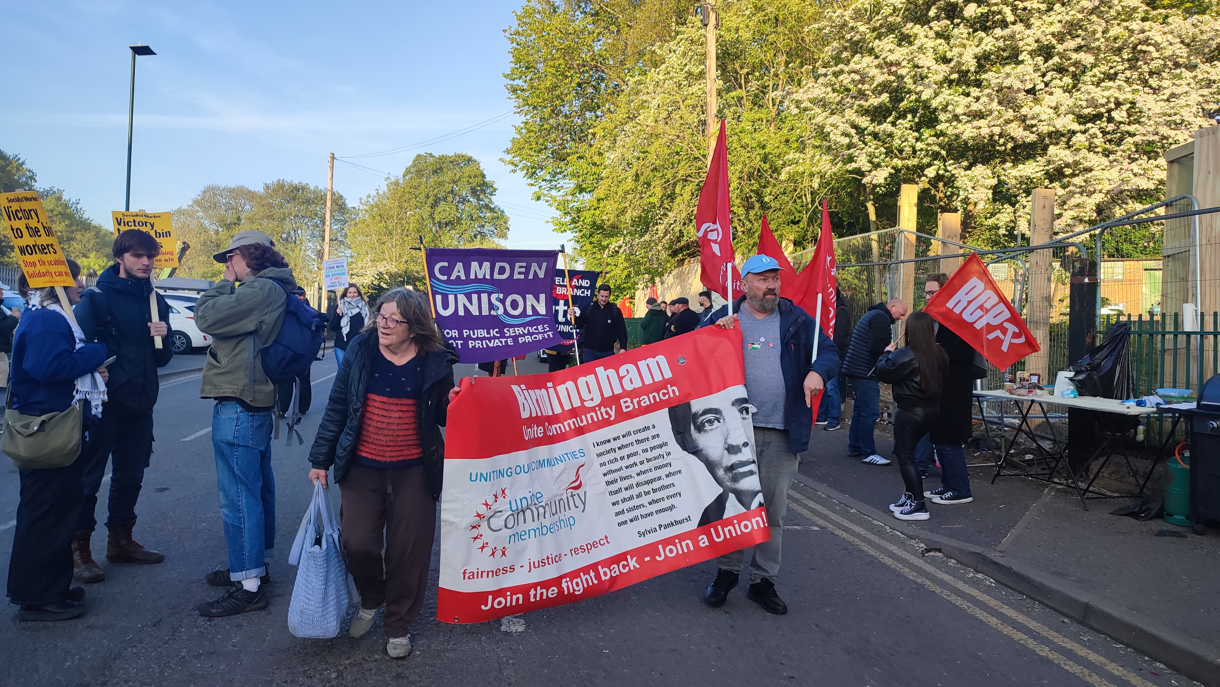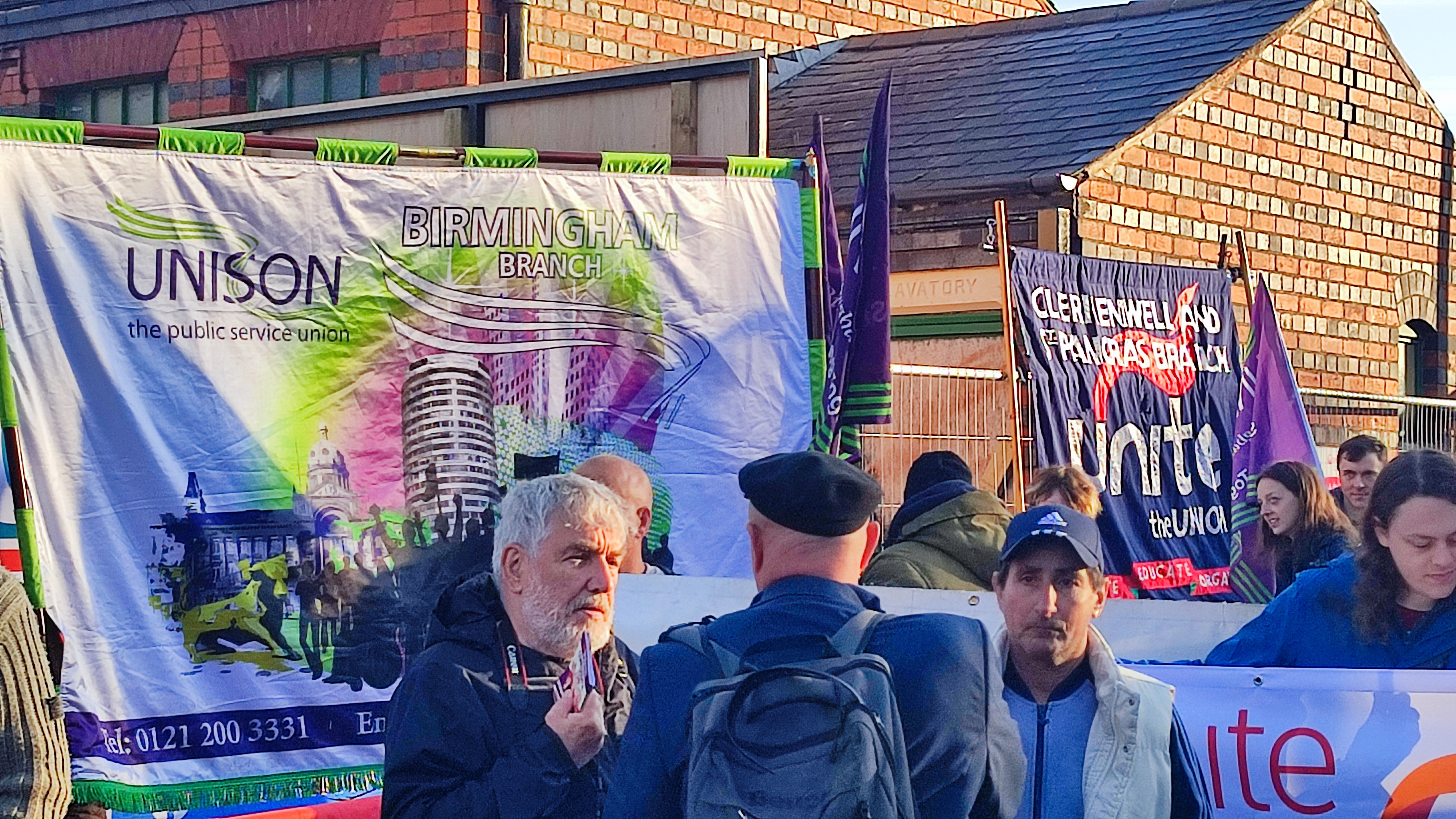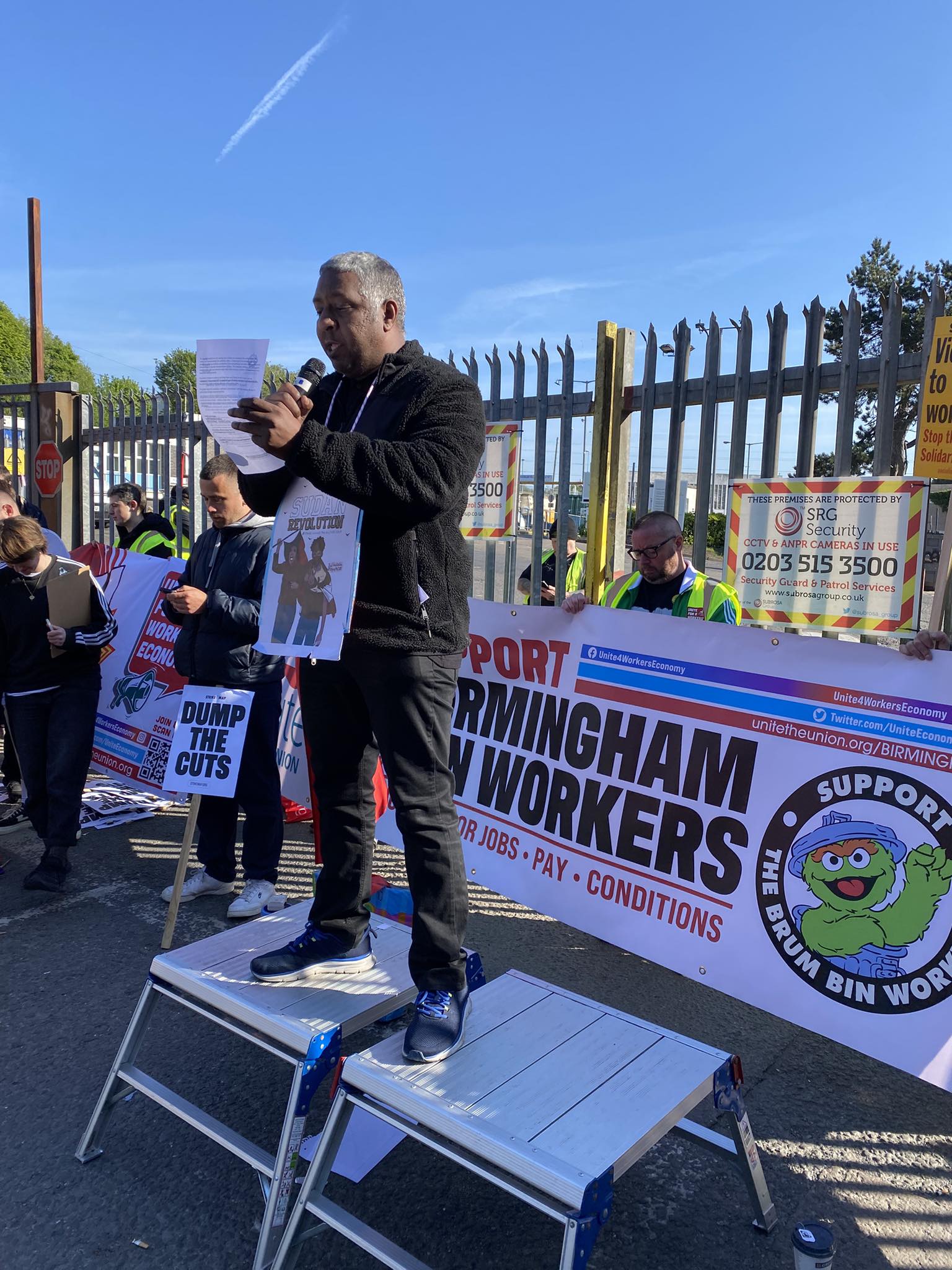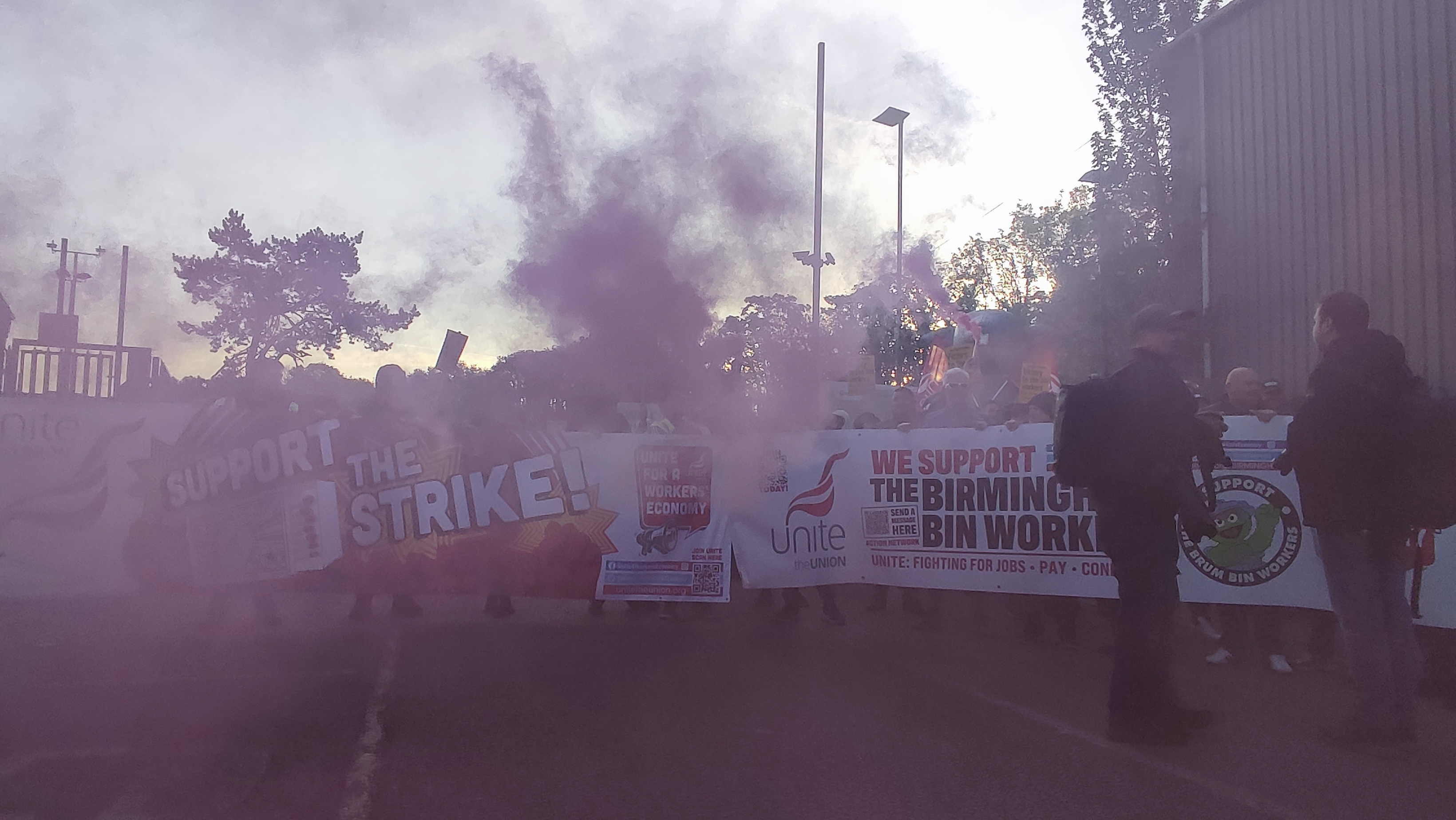 Bin workers represented by Unite the Union in Birmingham have been on indefinite strike since March. The dispute began in January after the almost bankrupt Birmingham City Council announced plans to scrap the role of Waste Recycling and Collection Officer (WRCO), a move that would slash thousands of pounds from workers’ pay. The strikers have received massive support from the trade union movement, culminating in a mass picket today attended by hundreds of workers and supporters from across the UK trade union movement and civil society organisations. Dozens of banners filled the picket lines, and speakers from various unions and organisations voiced strong support for the strikers, condemning the Labour government’s continued attacks on working-class people.