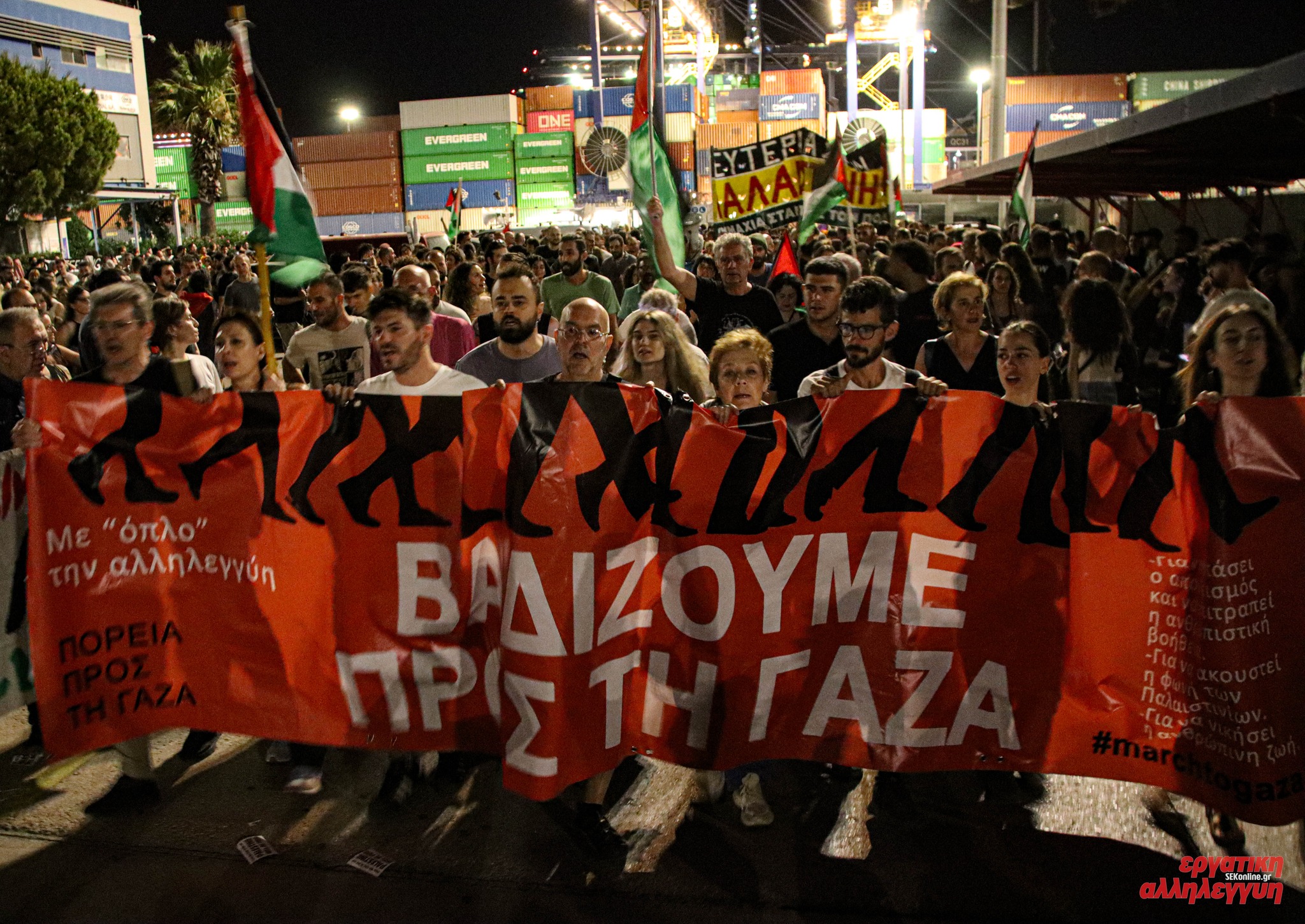 Dockworkers in Greece are the latest to take action to stop war material reaching the Israeli army as it intensifies its genocidal campaign in Gaza. A mass blockade of Piraeus port, called by dockworkers’ unions and supported by Palestine solidarity and anti-war activists and local trade unionists on 16 July stopped the transshipment of steel destined for Israel Military Industries. In response to a call-out from dockworkers union ENEDEP, hundreds of activists from Piraeus Labour Center, the Stop the War – Solidarity with Palestine Alliance, the March to Gaza Greece, the BDS movement, radical left party ANTARSYA and the Coordination of Labor Resistance gathered on 14 July to attempt to block the unloading of military materials bound for Israel from the ship Evengolden. The cargo was set to be loaded onto another ship, the Cosco Pisces due to leave Piraeus on 16 July. Dock workers called for another mass mobilisation that night which stopped the loading of the Israeli cargo. ENEDEP members clearly stated that they would unload all containers, except those containing war material.