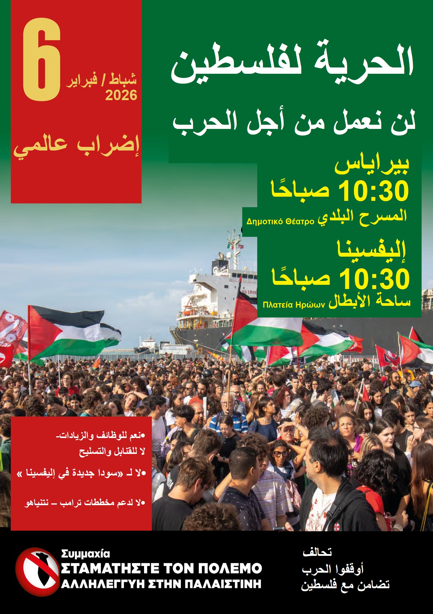 On February 6, we are striking and demonstrating in solidarity with Palestine. We are joining forces with port workers’ unions in Italy, the Basque Country, Morocco, Turkey, and Greece, whose slogan is “Port workers do not work for war!” calling for an International Day of Action demanding an end to the genocide in Palestine and all transport of war material, an embargo on Israel and the opening of stable humanitarian corridors, the rejection of the EU’s rearmament plan, which diverts billions from social needs and reinforces the militarization and privatization of services and the attack on workers’ rights and achievements.