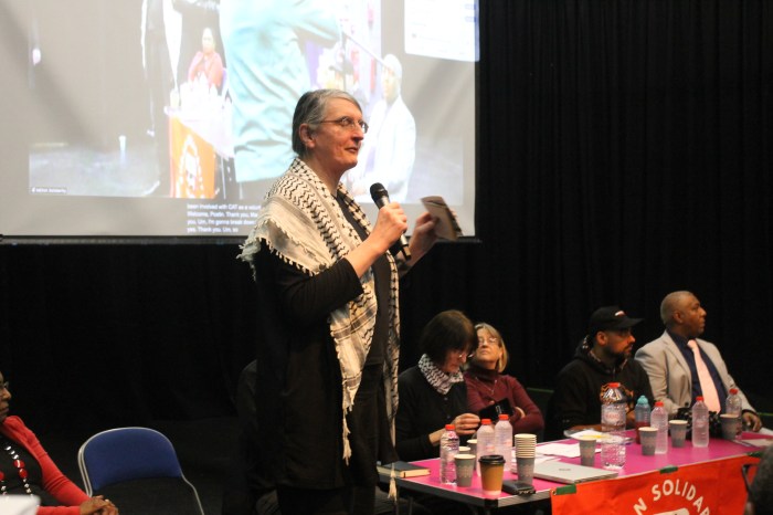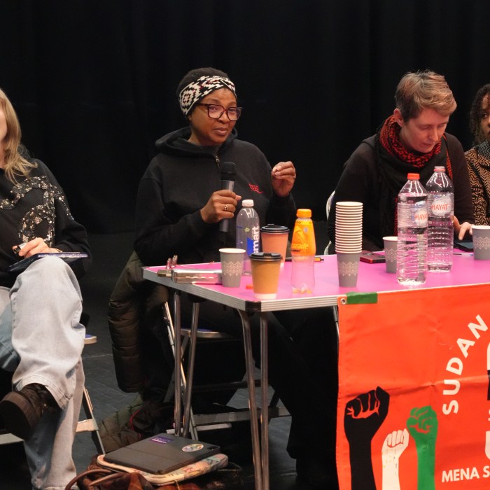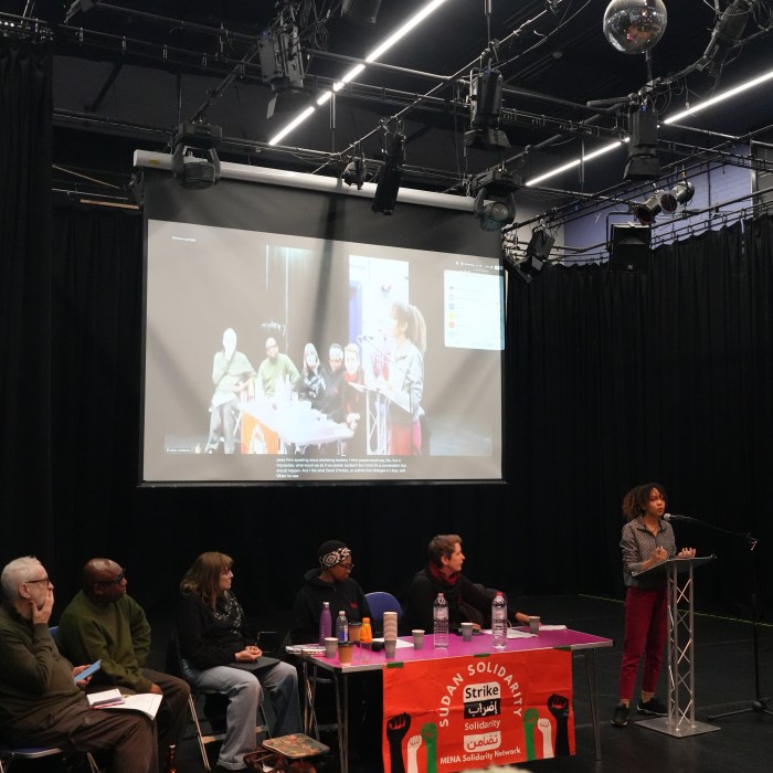 Lynda Rooke, actor and president of Equity, the UK trade union for 50,000 entertainment workers, expressed solidarity with the Sudanese people and other struggles worldwide, noting that her union works globally through the International Federation of Actors. She drew on her own Irish heritage and her father’s experience of discrimination, observing that “the systematic racism and scapegoating of current refugees and migrants… stems exactly from that power” rooted in colonialism, slavery, and the capitalist system”.