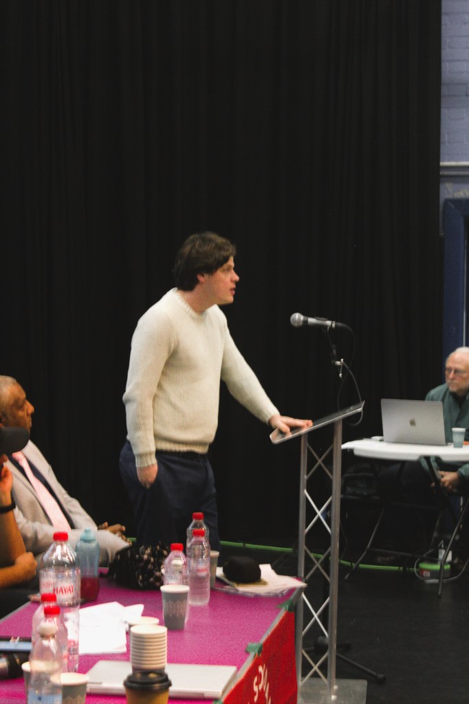 Maria Chondrogianni, representing the Post-16 Education Union (UCU), delivered a powerful call to action, grounding her remarks in the ongoing humanitarian catastrophe in Sudan. She opened by stressing the hidden but catastrophic scale of the crisis: “The worst humanitarian crisis in the world… famine, insecurity, genocide, displacement is taking place also in Sudan”, and criticised the media for failing to bring global attention to it. Chondrogianni highlighted the systematic impact on children, demanding basic human rights including food, water, peaceful sleep, and education. “We need to demand to keep on hearing about it, and we need to demand to put an end to it”, she insisted.